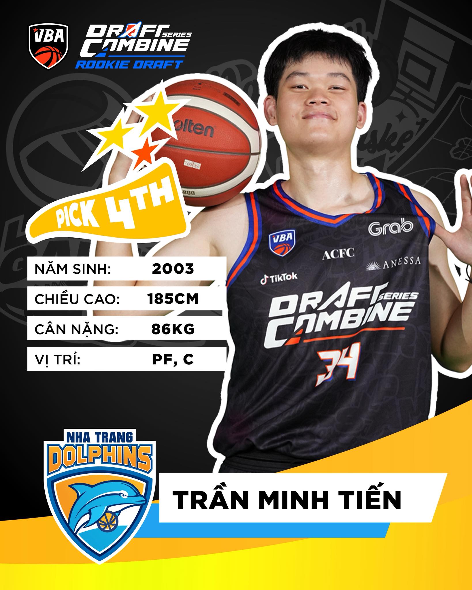 Ở lượt lựa chọn thứ tư, Nha Trang Dolphins gọi tên Trần Minh Tiến, bigman sinh năm 2003, cao 1m85, nặng 86kg của CLB Dolphins Junior. Đây là lựa chọn thú vị khi đội bóng thành phố biển Nha Trang quyết định pick cầu thủ thuộc hệ thống đào tạo của mình, trao cơ hội thi đấu chuyên nghiệp đầu tiên cho Minh Tiến.