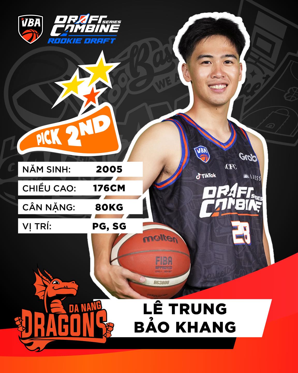 Với lượt thứ hai, Danang Dragons đã lựa chọn một cầu thủ quê Đà Nẵng là Lê Trung Bảo Khang, một trong những cái tên để lại nhiều ấn tượng nhất ở chuỗi sự kiện VBA Draft Combine 2026. Bảo Khang sở hữu chiều cao 1m76, năm nay 21 tuổi, chơi ở vị trí hậu vệ và từng 2 lần lên ngôi vô địch toàn quốc của Giải bóng rổ sinh viên toàn quốc NUC.