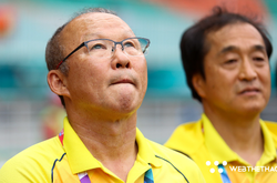 HLV Park Hang Seo dù đang rất căng thẳng cũng phải bật cười khi thấy Son Heung Min đứng ngay sau lưng khi ông đang trao đổi với các cầu thủ Olympic Việt Nam.