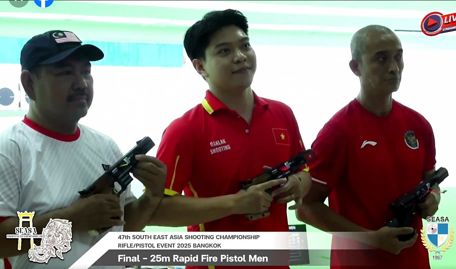 Bắn súng Việt Nam có tới 3 xạ thủ lọt vào phần thi chung kết nội dung 25m súng ngắn bắn nhanh cá nhân nam tại giải Vô địch bắn súng Đông Nam Á 2025 (SEASA) diễn ra đầu giờ chiều nay 14-10. Và khi cuộc đấu khép lại, đã có thêm tấm HCV in màu cờ đỏ sao vàng.
