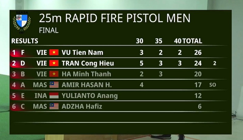Và kết quả chung cuộc người mang về HCV tiếp theo ở nội dung súng ngắn là xạ thủ trẻ Vũ Tiến Nam (Quân đội) với thành tích 26 điểm, hơn 2 điểm so với đồng đội Công Hiếu. Tất nhiên, thành tích trên cũng có nghĩa tấm HCV đồng đội tuyệt đối ở nội dung này cho đội tuyển Việt Nam.