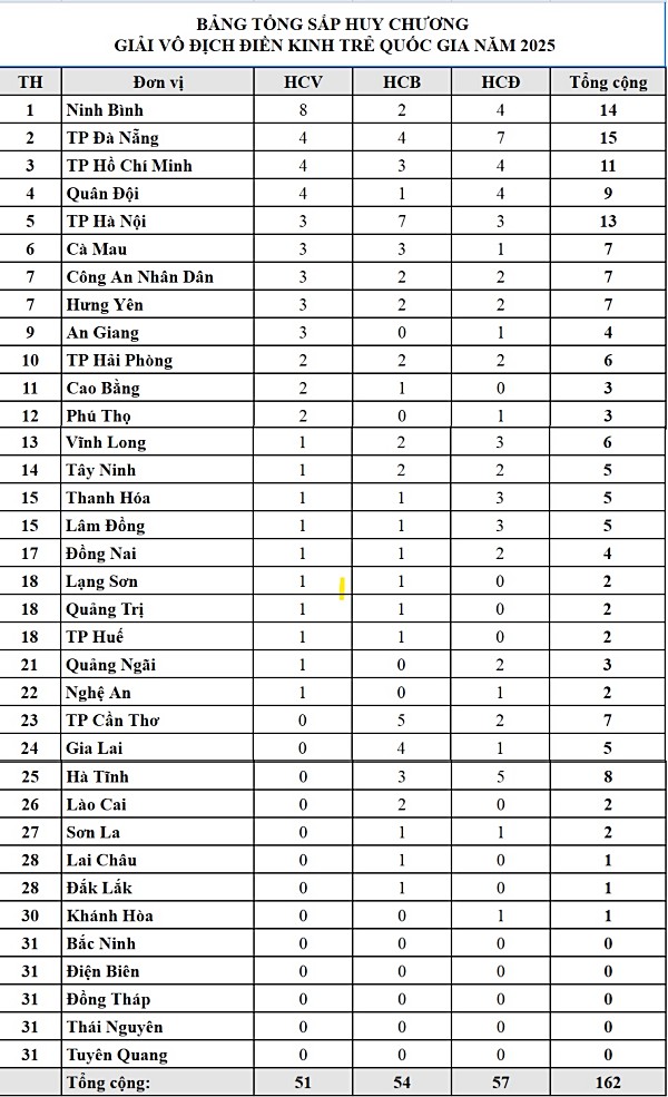 Bảng tổng sắp huy chương giải Vô địch Điền kinh Trẻ quốc gia năm 2025 đang diễn ra tại sân vận động Tam Kỳ (Đà Nẵng) sẽ liên tục được Webthethao cập nhật chi tiết sau mỗi ngày thi đấu tại đây.