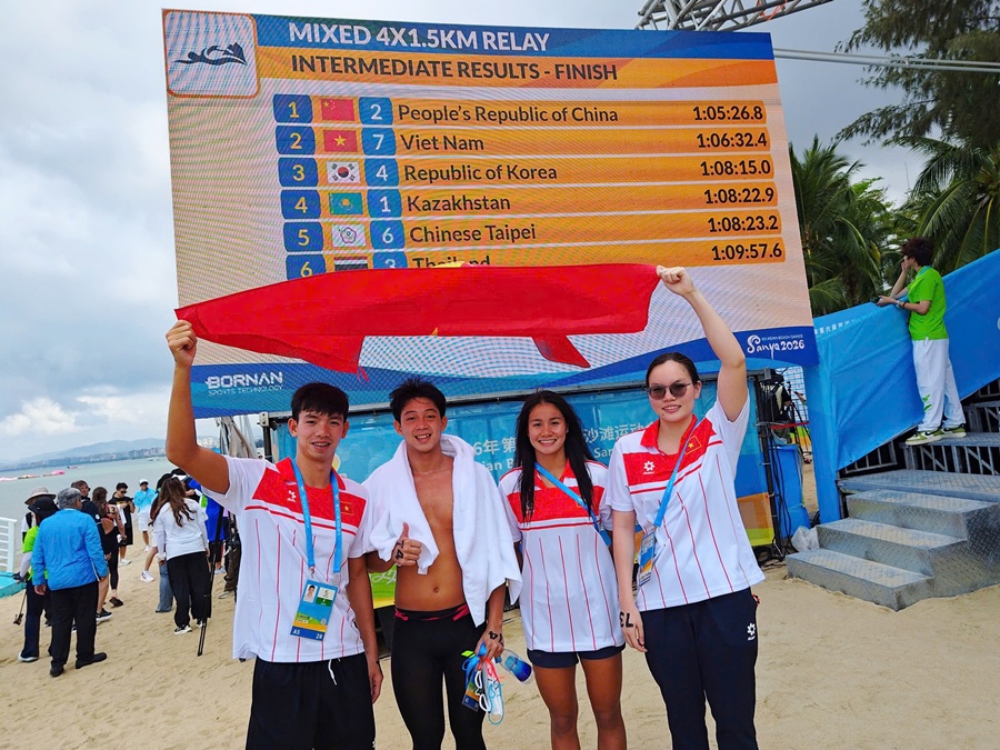 Đội tuyển bơi biển Việt Nam xếp thứ hai nội dung tiếp sức 4x1.500m tại Đại hội Thể thao Bãi biển Châu Á 2026 với thành tích 1 giờ 06 phút 32 giây.