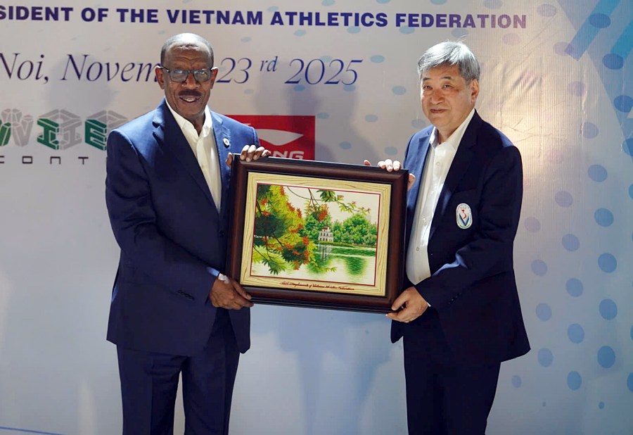 Chủ trì buổi tiếp đón là Chủ tịch Liên đoàn Điền kinh Việt Nam, ông Hoàng Vệ Dũng, cùng các phó chủ tịch và tổng thư ký Nguyễn Mạnh Hùng.