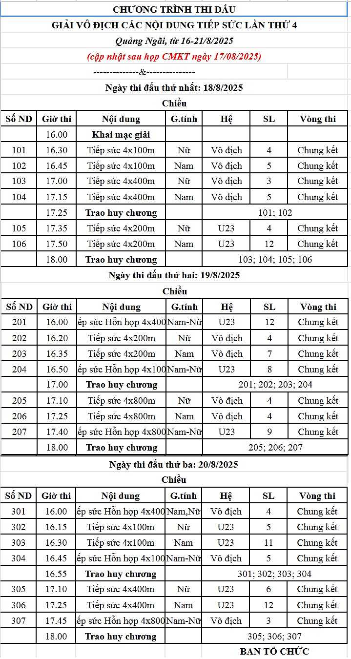 Giải Vô địch điền kinh các nội dung tiếp sức quốc gia năm 2025 diễn ra từ ngày 16-21/8, tại sân vận động chính của tỉnh Quảng Ngãi. Trong đó, thời gian thi đấu chính thức dự kiến sẽ diễn ra trong 3 ngày, đều vào các buổi chiều đó là chiều ngày 18/8, 19/8 và 20/8.