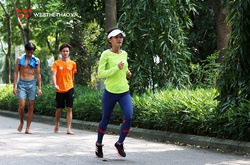 Kỷ lục gia SEA Games 30 Nguyễn Thị Oanh gắng sức hoàn thành các bài tập khó khăn dưới điều kiện nắng nóng 40 độ C ở miền Bắc trước thềm Tiền Phong Marathon 2020.