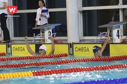 Dù không được thi đấu nhưng "tiểu tiên cá" Ánh Viên vẫn đến Cung thể thao dưới nước để cỗ vũ cho các VĐV tranh tài tại giải bơi Vô địch Quốc gia 2016.