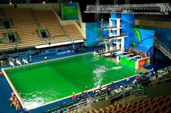 Một hiện tượng lạ xảy ra khi màu nước của bể bơi tại TT thể thao dưới nước Maria Lenk bị biến thành màu xanh lá thẫm.