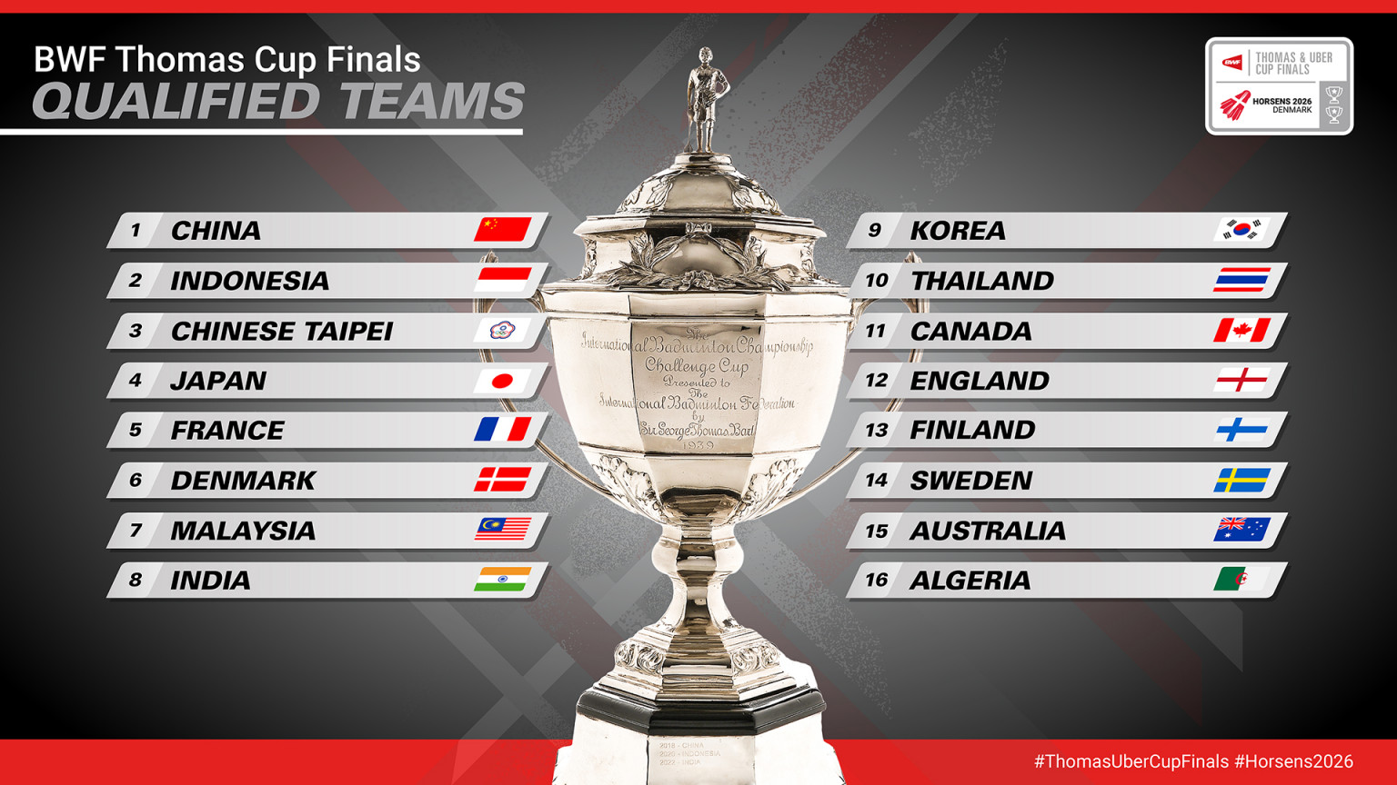 Việc hai "ông lớn" là đội tuyển nam Đức và đội tuyển nữ Pháp bất ngờ rút lui đã tạo nên những thay đổi trong danh sách 16 đội tham dự Thomas & Uber Cup 2026.