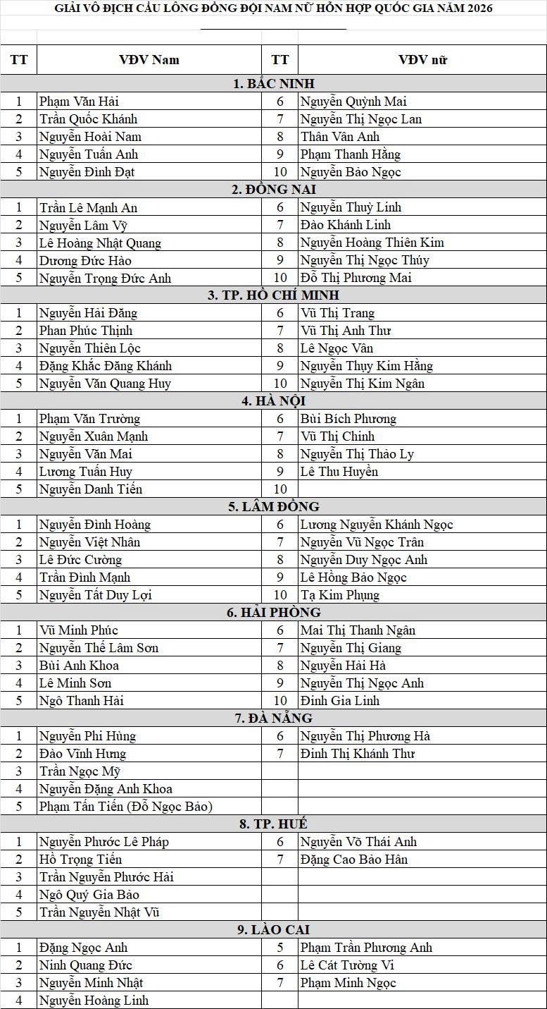 Diễn ra từ ngày 20/4 đến 25/4/2026, giải đấu cầu lông vô địch đồng đội nam nữ hỗn hợp quốc gia năm nay ghi nhận sự tham gia của 9 đơn vị giàu truyền thống và tiềm lực, chia làm hai nhóm đấu cạnh tranh quyết liệt. Nhóm A được xem là "bảng tử thần" với sự xuất hiện của Bắc Ninh, Đồng Nai, Hà Nội, TP.HCM và chủ nhà Lâm Đồng. Trong khi đó, nhóm B gồm Hải Phòng, Đà Nẵng, TP. Huế và Lào Cai cũng hứa hẹn nhiều bất ngờ trong cuộc đua giành vé vào bán kết.