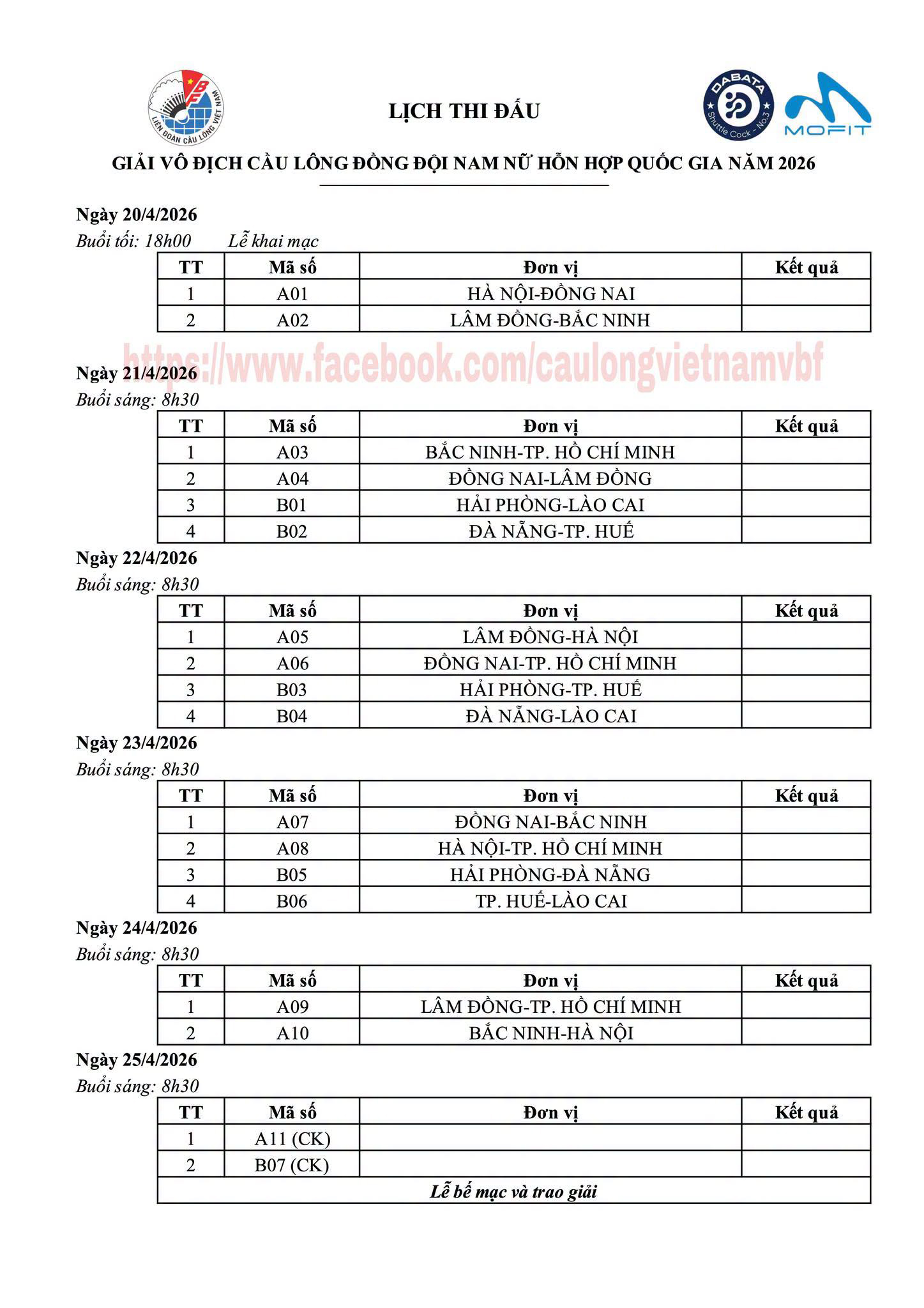 XEM LỊCH THI ĐẤU CẦU LÔNG GIẢI VÔ ĐỊCH ĐỒNG ĐỘI NAM NỮ HỖN HỢP QUỐC GIA NĂM 2026 MỚI NHẤT