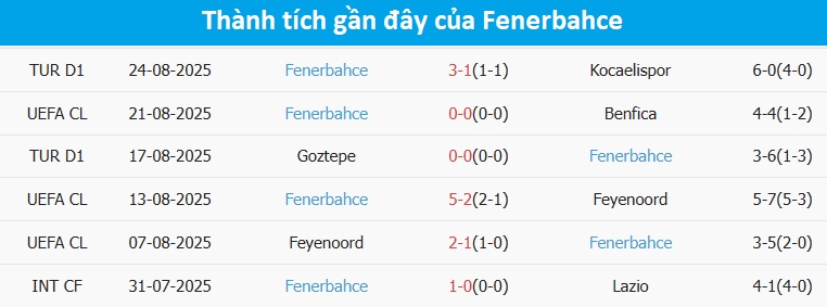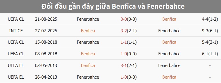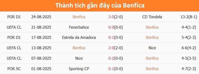 Tỷ lệ trận đấu: Benfica thắng 8/10 trận gần đây theo tỷ số châu Á, chỉ thua 1. Về phần mình, Fenerbahce chỉ thắng 2/5 trận chính thức mới nhất.