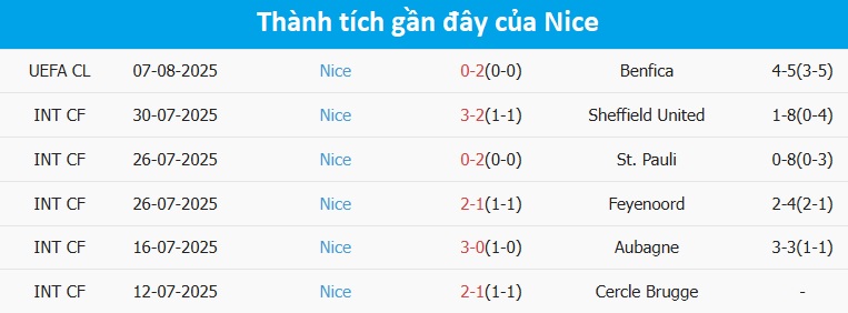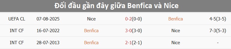 Tổng bàn thắng cả trận: 7/10 trận gần đây của Benfica dưới mốc tổng bàn thắng, giữ sạch lưới 2 trận chính thức mới nhất. Điều tương tự cũng xảy ra ở 2/3 trận vừa qua của Nice.
