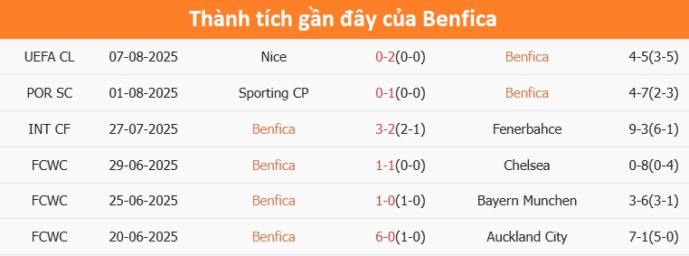 Tỷ lệ trận đấu: Benfica trải qua 6 trận thắng liên tiếp theo tỷ số châu Á, gồm cuộc đối đầu trước Nice. Về phần mình, Nice thua 2/3 trận mới nhất.