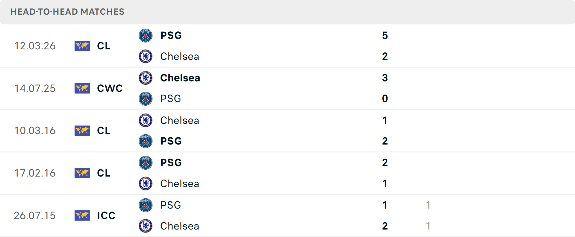 Tỷ lệ trận đấu: Chelsea thua PSG 5/6 cuộc đối đầu trước đó theo tỷ số châu Á, chỉ thắng 2/10 trận trước đó. Chelsea cũng toàn thua 3 trận vừa qua. Phía bên kia, PSG thắng trận mới nhất.