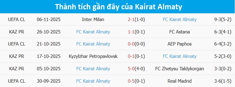 Tỷ lệ trận đấu: Copenhagen thua 8/10 trận gần đây theo tỷ số châu Á, gồm cả 3 ở Champions League. Về phần mình, Kairat Almaty chỉ thua 2/10 trận trước đó.