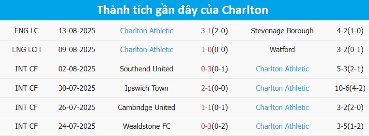 Cũng có màn khởi đầu suôn sẻ là Charlton với chiến thắng 1-0 trước Watford ở hạng Nhất Anh và Stevenage Borough ở Cúp Liên đoàn. Nhưng mọi thứ sẽ khó khăn hơn khi họ lần đầu phải đi làm khách, trước một đối thủ đang rất hưng phấn. Charlton có thể bị cuối vào lối chơi tấn công của đối phương, tạo nên thế trận cởi mở và có nhiều bàn thắng.
