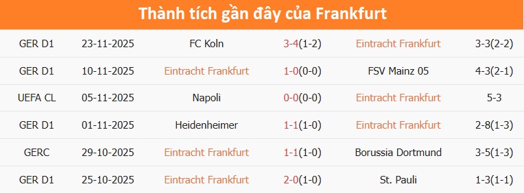 Frankfurt đang cho thấy sự ổn định trở lại sau chuỗi trận thảm họa. Sau 2 trận giữ sạch lưới liên tiếp, họ vừa có chiến thắng nghẹt thở 4-3 trước Koln, nối dài chuỗi 5 trận bất bại tại Bundesliga và cho thấy hàng công (ghi ít nhất 2 bàn trong 9 trận mùa này) luôn là mối đe dọa. Dù trải qua các trận thua đậm trước Liverpool và Atletico, việc cầm hòa Napoli 0-0 đã giúp họ củng cố vị trí trong Top 24.