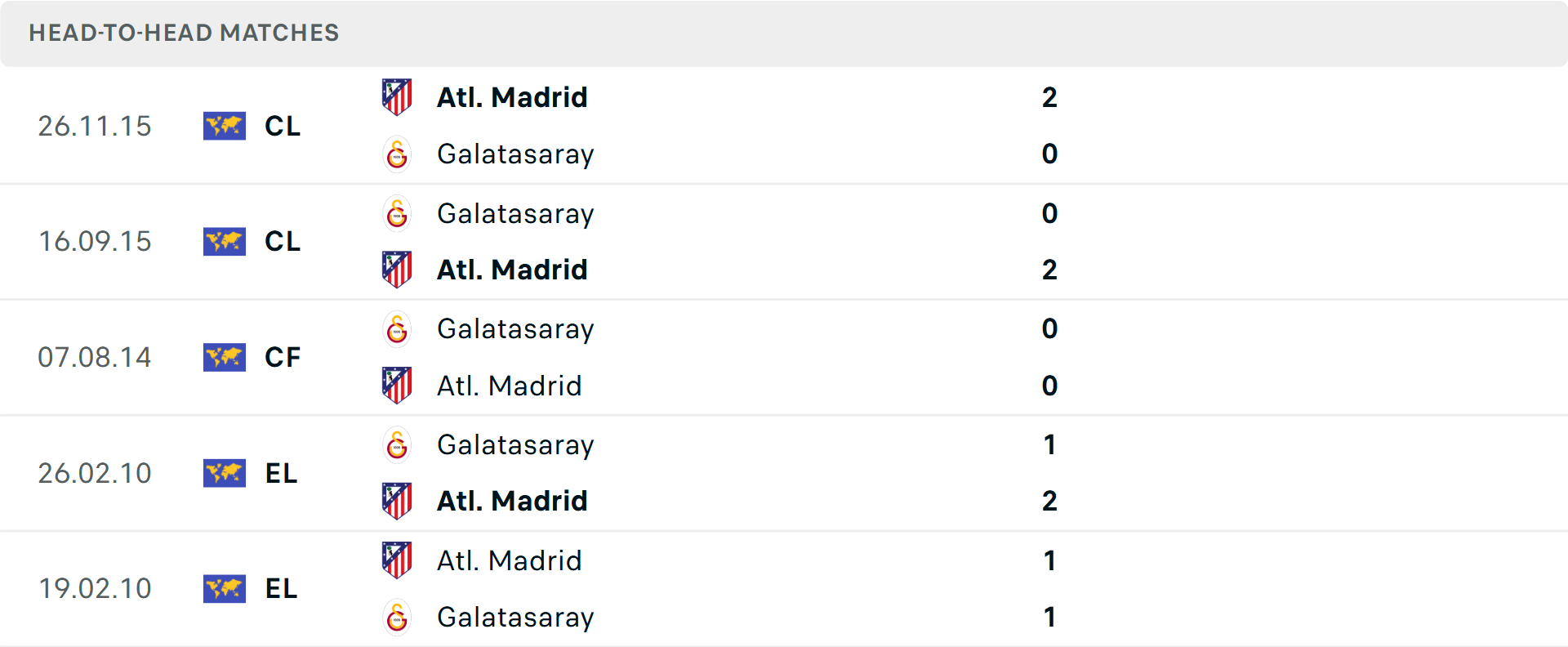 Lịch sử đang nghiêng hẳn về phía Atletico khi đại diện Tây Ban Nha chưa từng thua Galatasaray trong các cuộc đối đầu chính thức, thắng 5 trận gần nhất trước các đội bóng Thổ Nhĩ Kỳ. Ngược lại, Galatasaray chỉ thắng được 1 trong 21 trận gặp các đại diện từ La Liga. Dù đang đứng thứ 18 với 9 điểm, đội quân của HLV Okan Buruk lại có phong độ phập phù tại đấu trường châu Âu mùa này với 3 thắng và 3 thua.