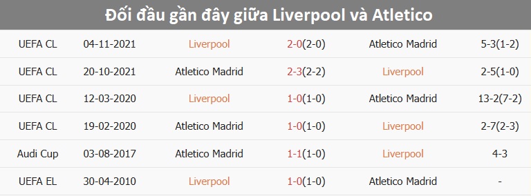 Tổng bàn thắng cả trận: 8/10 cuộc đối đầu trước đó giữa hai đội dưới mốc tổng bàn thắng. Điều tương tự cũng xảy ra ở 2 trận vừa qua của Liverpool và 6/7 trận của Atletico.