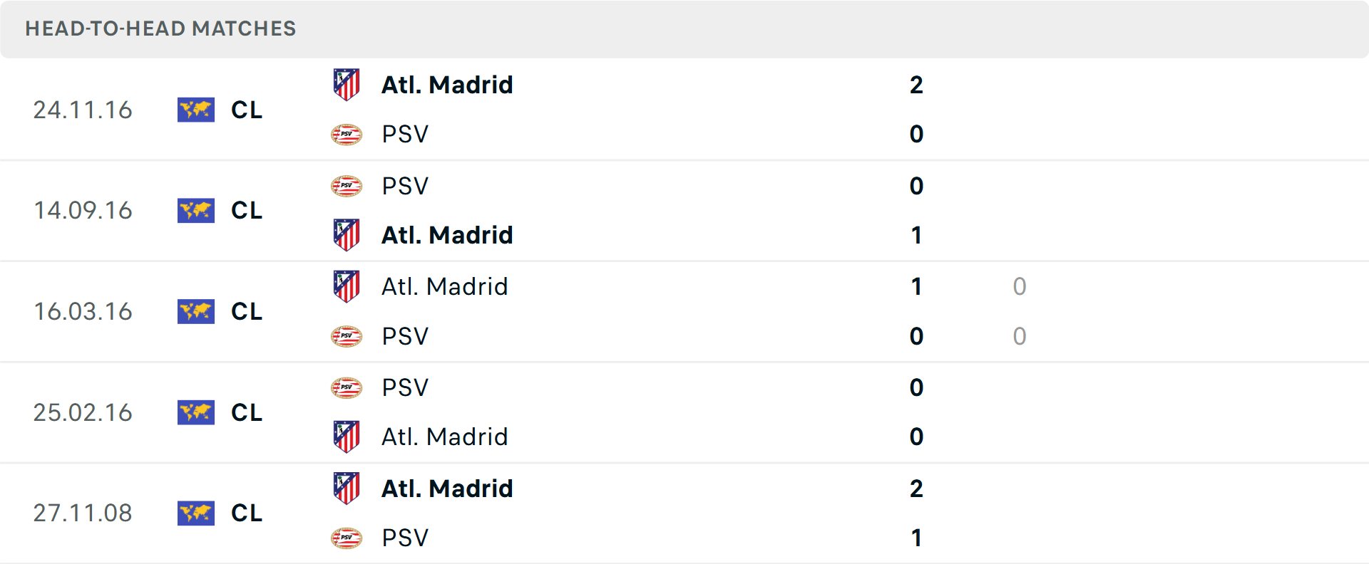 Ngược lại, Atletico Madrid dù có chiến thắng ấn tượng 2-1 trước Inter Milan nhưng lại bước vào trận đấu này sau hai thất bại liên tiếp tại La Liga. Lịch sử đối đầu ủng hộ Rojiblancos khi họ chưa từng thua PSV (thắng 5/6 lần). Tuy nhiên, phong độ sân khách của Atletico lại rất tệ khi không thắng 8/10 trận gần nhất khi xa nhà.