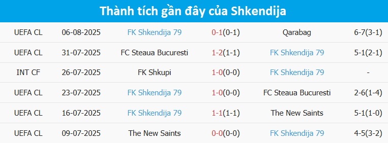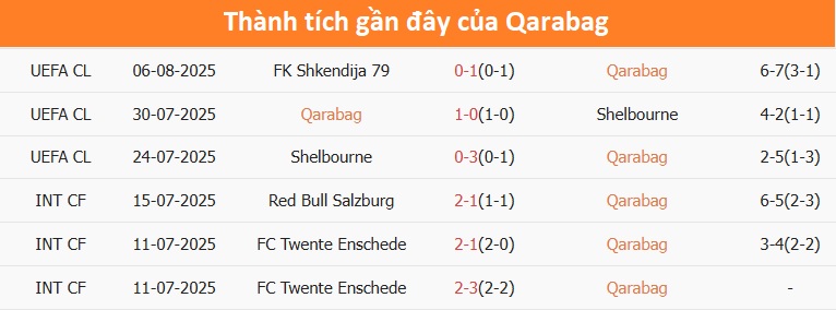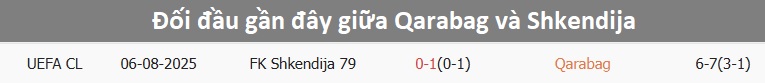 Tỷ lệ trận đấu: Qarabag thắng 3/4 trận vừa qua theo tỷ số châu Á, gồm 2 ở Champions League. Về phần mình, Shkendija thắng 2 và thua 2 ở 4 trận mới nhất.