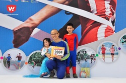 Hình ảnh các em bé vui vẻ chạy cùng nhau hay các bố các mẹ dắt tay con về đích tạo nên nét đẹp của giải Song Hong Half Marathon.