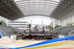 Cung thể thao dưới nước quốc gia Mỹ Đình (Hà Nội), nơi tổ chức các môn bơi, lặn, nhảy cầu của SEA Games 31 vẫn đang ở giai đoạn thi công nâng cấp, sửa chữa và đến 15/4/2022 sẽ được bàn giao.