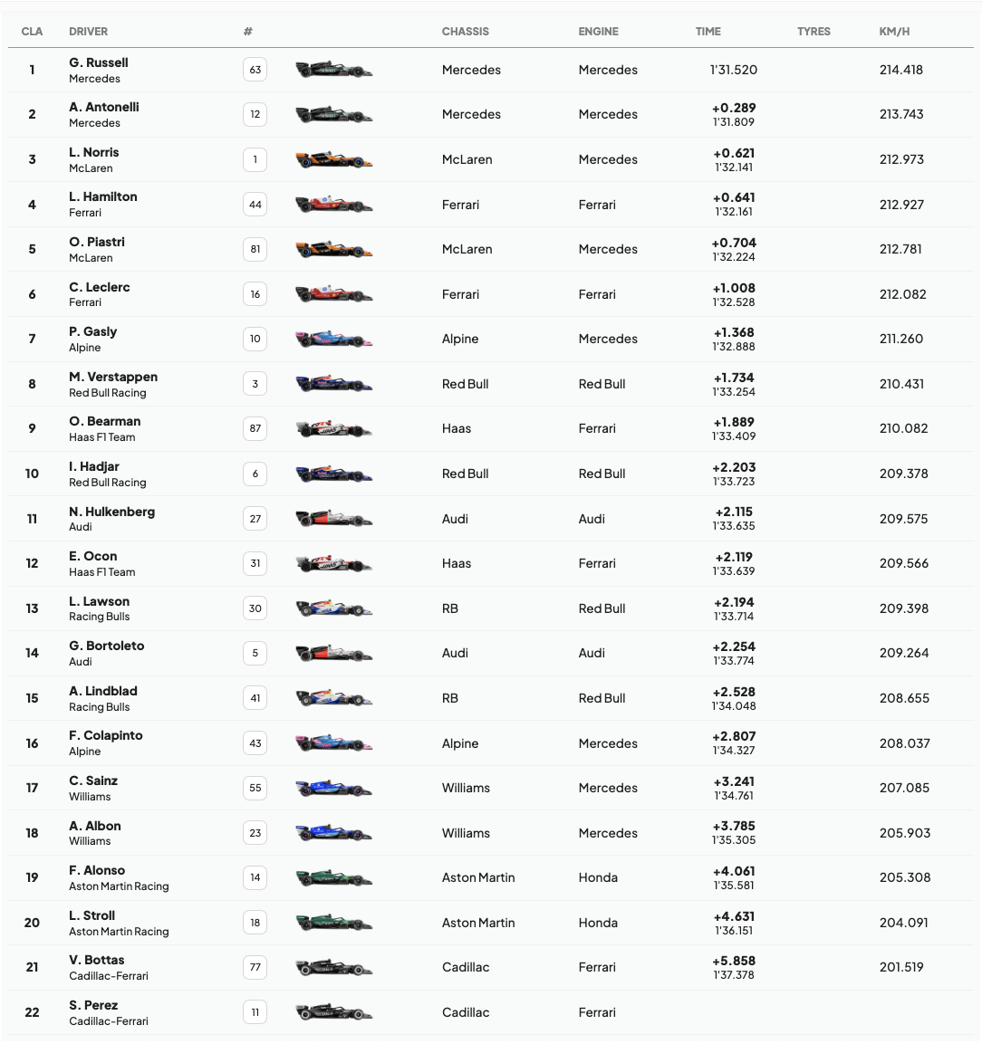 Ở vòng quyết định Q3, thời gian 1 phút 31.520 giây của Russell dễ dàng vượt qua Antonelli, Hamilton, Leclerc và Verstappen. Năm chiếc xe còn lại, gồm cả đội McLaren, chờ tới phút chót mới xuất phát. Antonelli và Leclerc có cải thiện thành tích nhưng không thể lật đổ đồng đội.