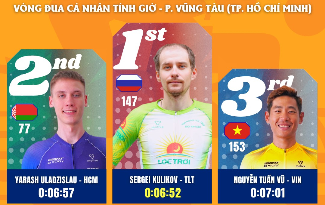 Hai tay đua xuất phát sau cùng đã thực hiện một cuộc lật đổ ngoạn mục. Sergei Kulikov (Tập đoàn Lộc Trời An Giang) với những guồng chân mạnh mẽ và nỗ lực tột cùng đã cán đích với thời gian 6 phút 52 giây, chiếm ngôi nhất chặng. Đây đã là chặng thắng thứ 3 của tay đua này tại giải năm nay, cho thấy hiệu quả tối đa từ chiến lược chiêu mộ tài năng quốc tế của đội đua miền Tây. Theo sát là Yarash Uladzislau (TP.HCM New Group) với 6 phút 57 giây, đẩy Tuấn Vũ xuống vị trí thứ 3.
