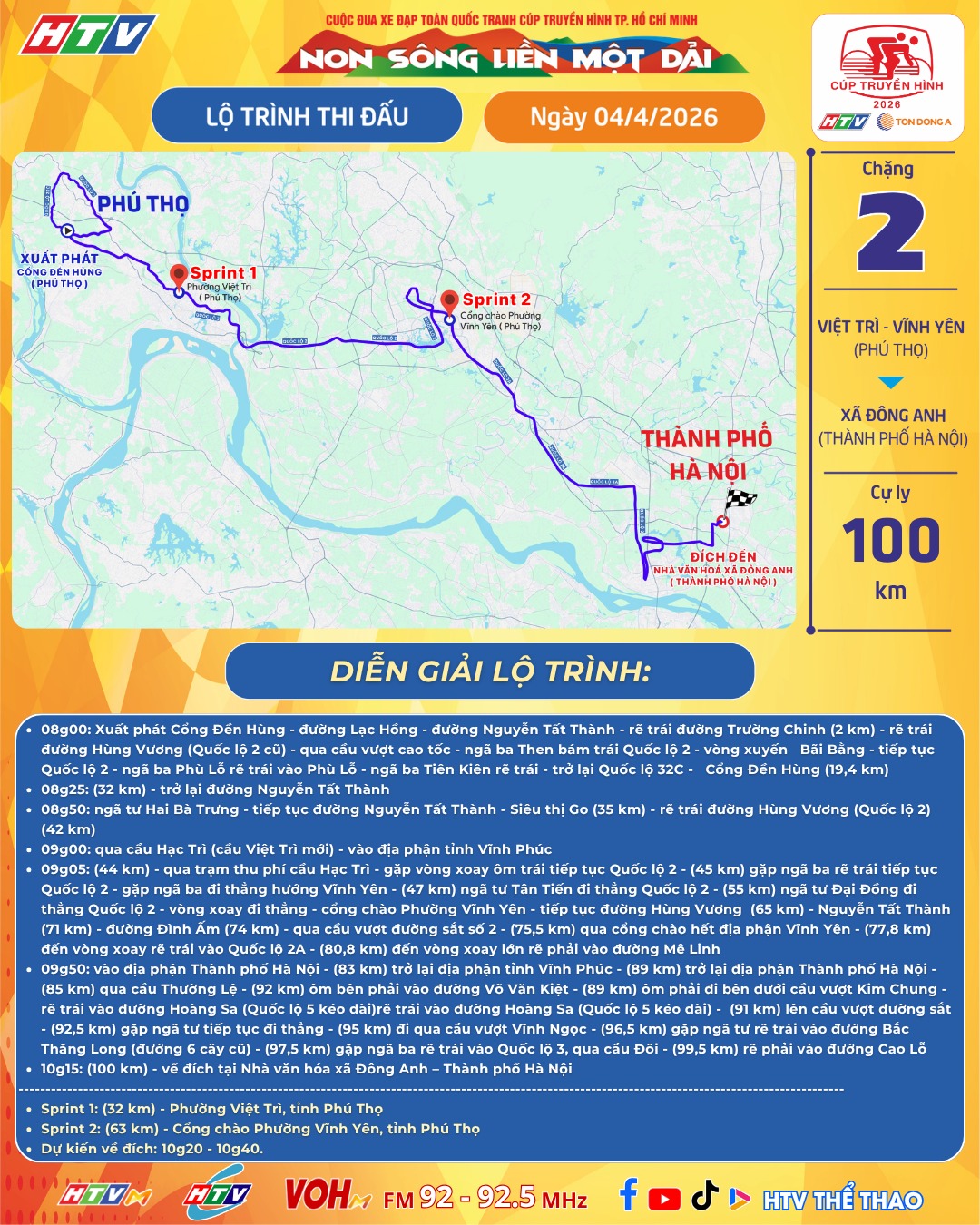 Sau khởi đầu đầy bất ngờ của Sergei Kulikov tại Phú Thọ, đoàn đua Cúp Truyền hình TP.HCM 2026 sẽ bước vào chặng 2 với lộ trình 100km tiến về Hà Nội. Đây không chỉ là thử thách về sức bền trên các cung đường quốc lộ mà còn là cơ hội để các ê-kíp tính toán chiến thuật bứt phá, tối ưu hóa giá trị thương hiệu ngay trong những ngày đầu của hành trình xuyên Việt.