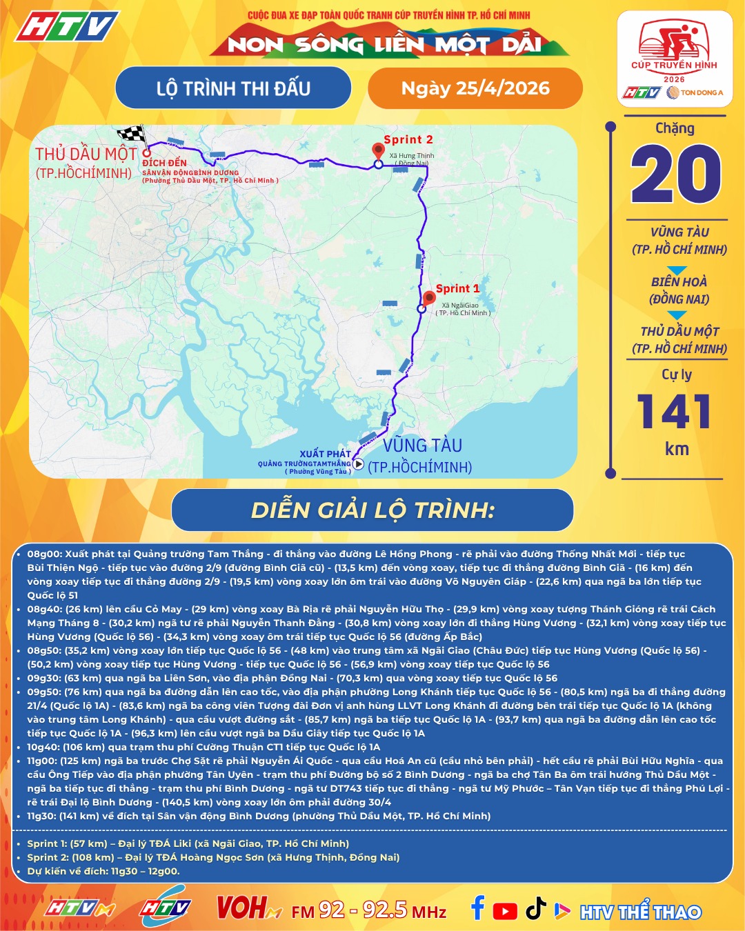 Trực tiếp đua xe đạp Cúp truyền hình TPHCM 2026 hôm nay. Link xem trực tuyến chặng 20 Cúp truyền hình TPHCM 2026 có lộ trình đua cá nhân tính giờ tại Vũng Tàu (TPHCM) đến Biên Hòa (Đồng Nai) rồi tới Thủ Dầu Một (TPHCM) , cự ly dài 141 km.