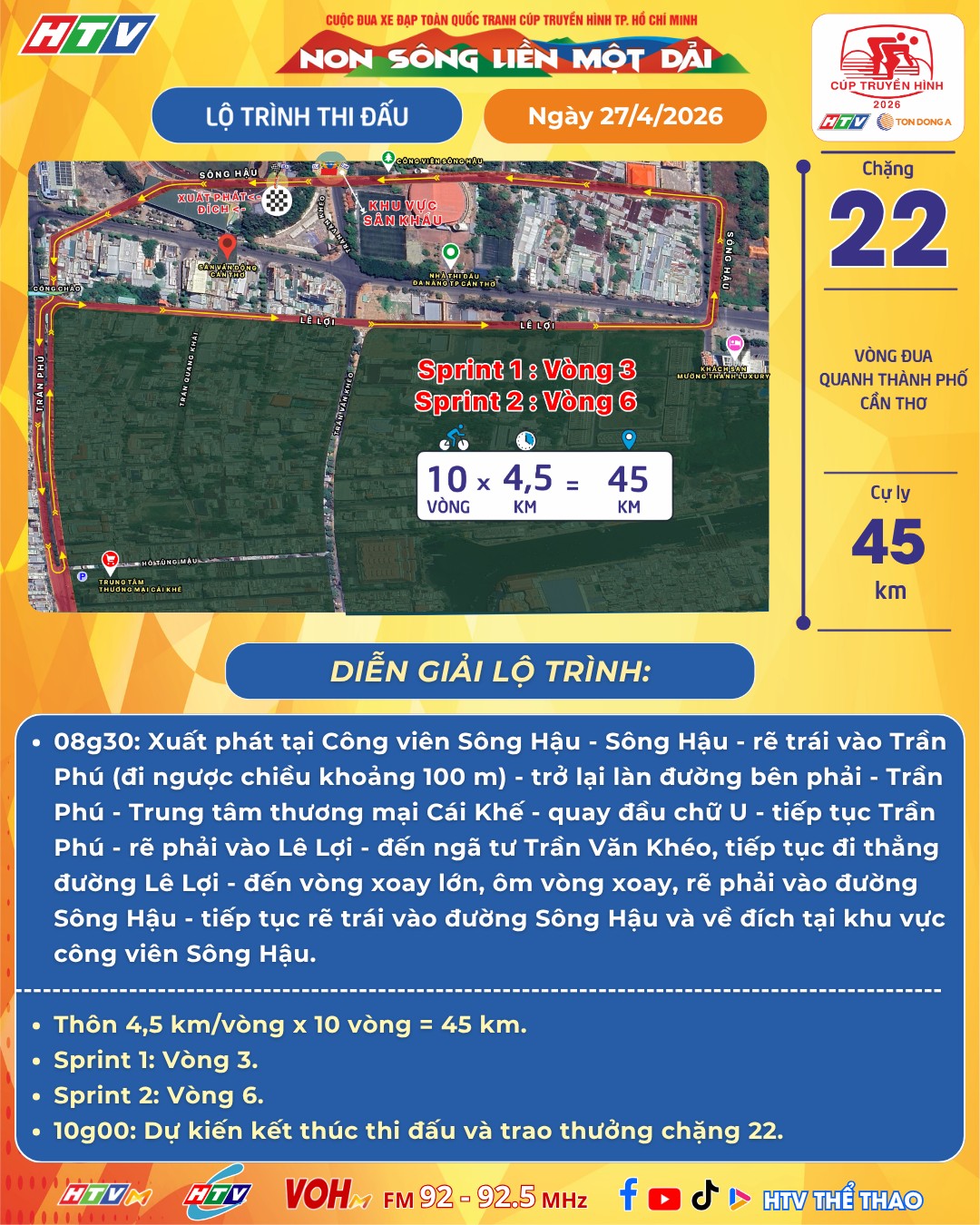 Lúc 8h30, các cua rơ xuất phát tại công viên Sông Hậu rồi đi theo lộ trình: