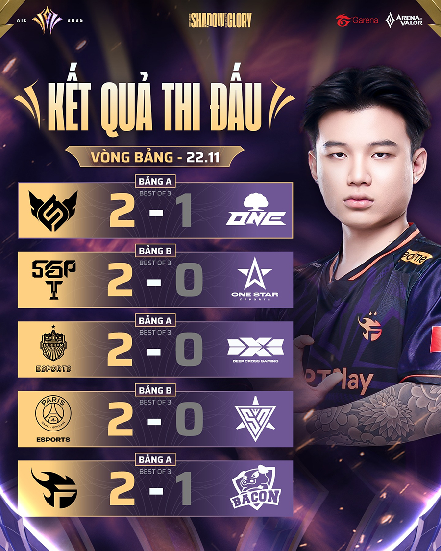 Sau ngày thi đấu đầu tiên hụt hơi, Saigon Phantom cho thấy phong độ ổn định khi đánh bại One Star Esports với tỷ số 2-0. Đại diện AOG áp đảo hoàn toàn trong cả hai ván nhờ khả năng kiểm soát bản đồ và giao tranh vượt trội. Chiến thắng này giúp SGP củng cố vị trí ở nhóm dẫn đầu và tiếp tục duy trì tinh thần cực kỳ hưng phấn tại giải năm nay.