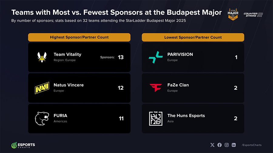 Phân tích toàn cảnh các đội tham dự cho thấy Team Vitality đang dẫn đầu với 13 nhà tài trợ, bao gồm các thương hiệu thiết bị gaming, thực phẩm và đồ uống. Tổ chức Pháp này đã vượt qua NAVI của Ukraine (11 đối tác) và FURIA đến từ Brazil cũng với 11 nhà tài trợ.