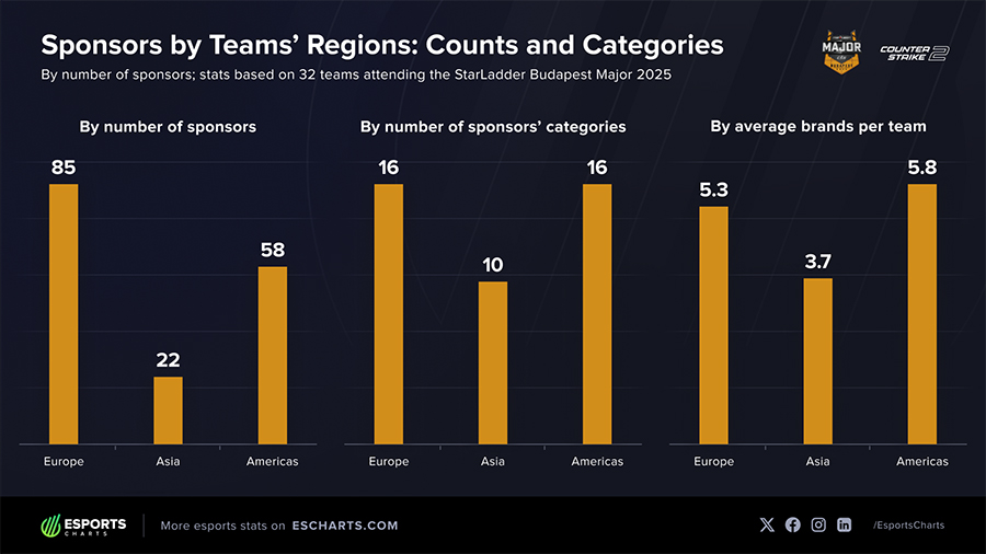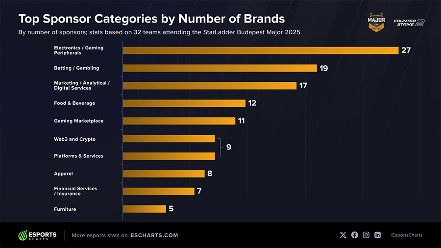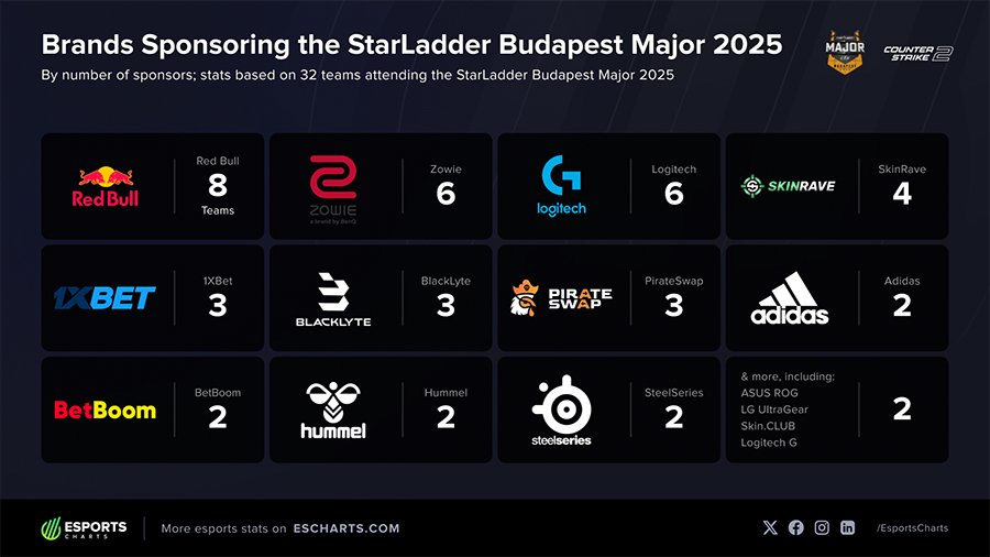Xét về các thương hiệu, Red Bull đang chiếm ưu thế khi tài trợ cho 8 đội tại Budapest Major, bao gồm những tên tuổi lớn như G2 Esports, Team Falcons và NAVI. Theo sau là ZOWIE (thương hiệu thiết bị gaming của BenQ) và Logitech, mỗi thương hiệu tài trợ 6 đội tuyển.
