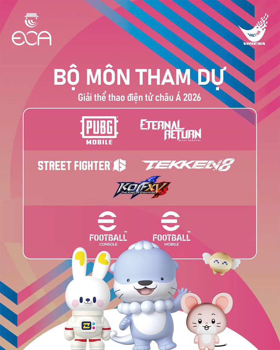 Năm nay, ECA 2026 quy tụ loạt bộ môn hấp dẫn, đa dạng từ mobile đến console, bao gồm: PUBG Mobile, Eternal Return, Street Fighter 6, Tekken 8, The King of Fighters XV và eFootball (Console & Mobile). Đội tuyển Việt Nam sẽ tham dự toàn bộ các bộ môn thi đấu tại ECA lần này. Việc góp mặt ở những bộ môn Esports mới cho thấy sự chủ động thích nghi và quyết tâm đa dạng hóa cũng như mở rộng sức cạnh tranh của thể thao điện tử Việt Nam trên đấu trường quốc tế.