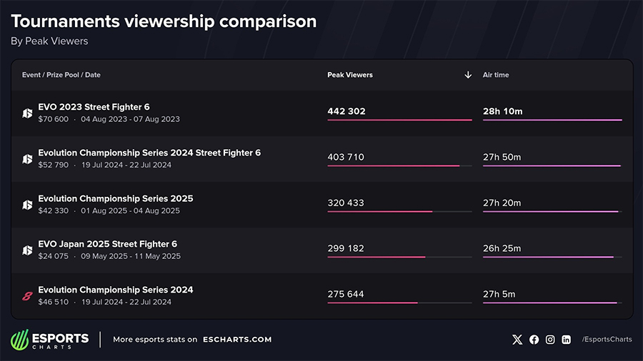 - Evo 2023: Đặt cột mốc mới với nội dung Street Fighter 6 đạt đỉnh 442.302 người xem cùng lúc (Peak Viewers).