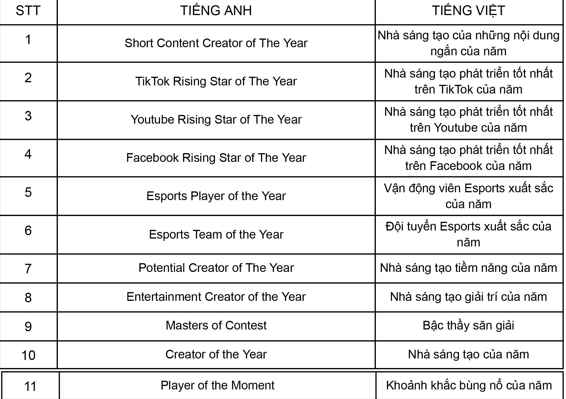 Các hạng mục do Ban Tổ Chức bình chọn: