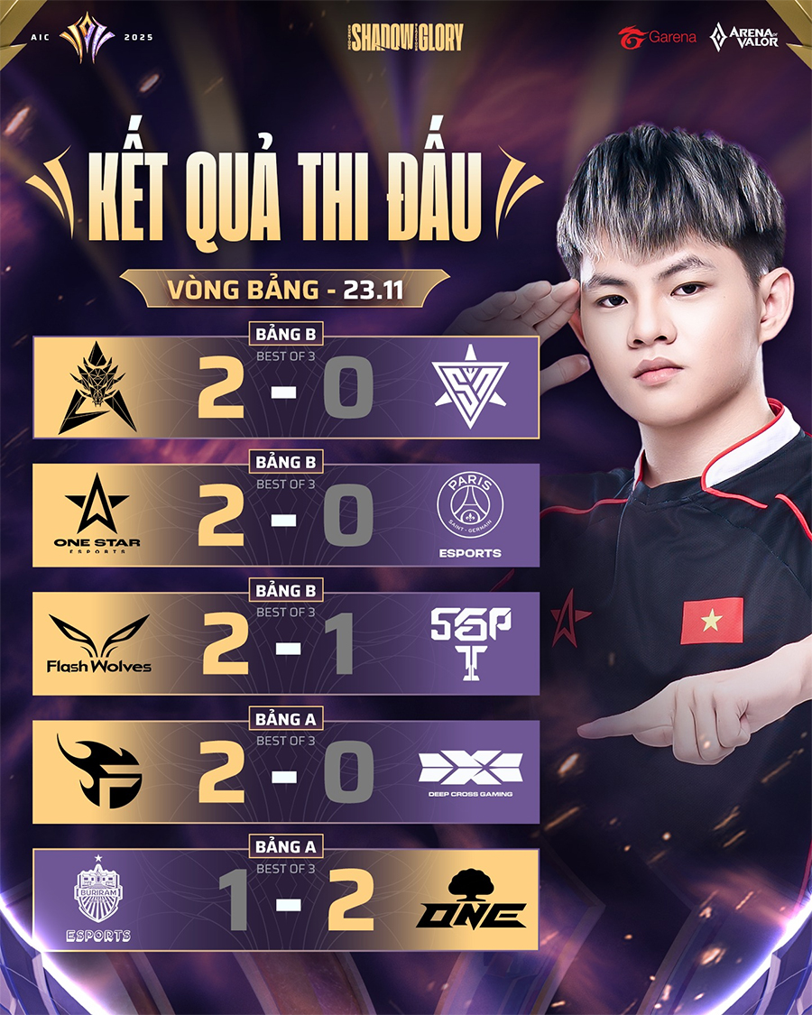 Ngày 23/11 đánh dấu lượt trận cuối cùng của vòng bảng AIC 2025, nơi cục diện hai bảng đấu chính thức khép lại với nhiều bất ngờ. Hai đại diện Việt Nam là One Star Esports và FPT x Flash xuất sắc giành vé đi tiếp, trong khi Saigon Phantom và Super Nova phải nói lời chia tay giải đấu.
