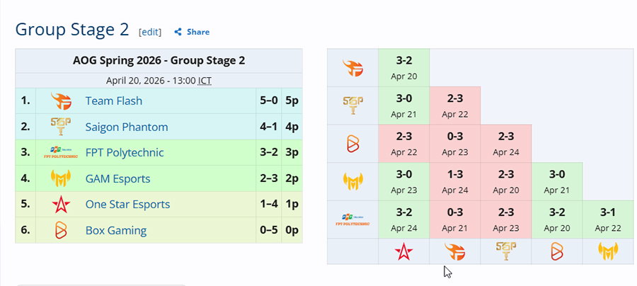 2. Vòng bảng – Giai đoạn 2 (20/04 – 24/04)