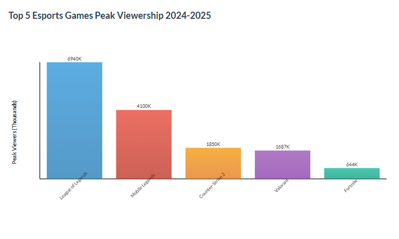 Theo báo cáo mới nhất về thống kê lượt xem Esports toàn cầu năm 2025, Liên Minh Huyền Thoại (League of Legends) vẫn là “tựa game quốc dân” khi dẫn đầu mọi bảng xếp hạng, trong khi các đại diện như Mobile Legends, Counter-Strike 2, Valorant và Fortnite lần lượt chiếm giữ các vị trí tiếp theo.
