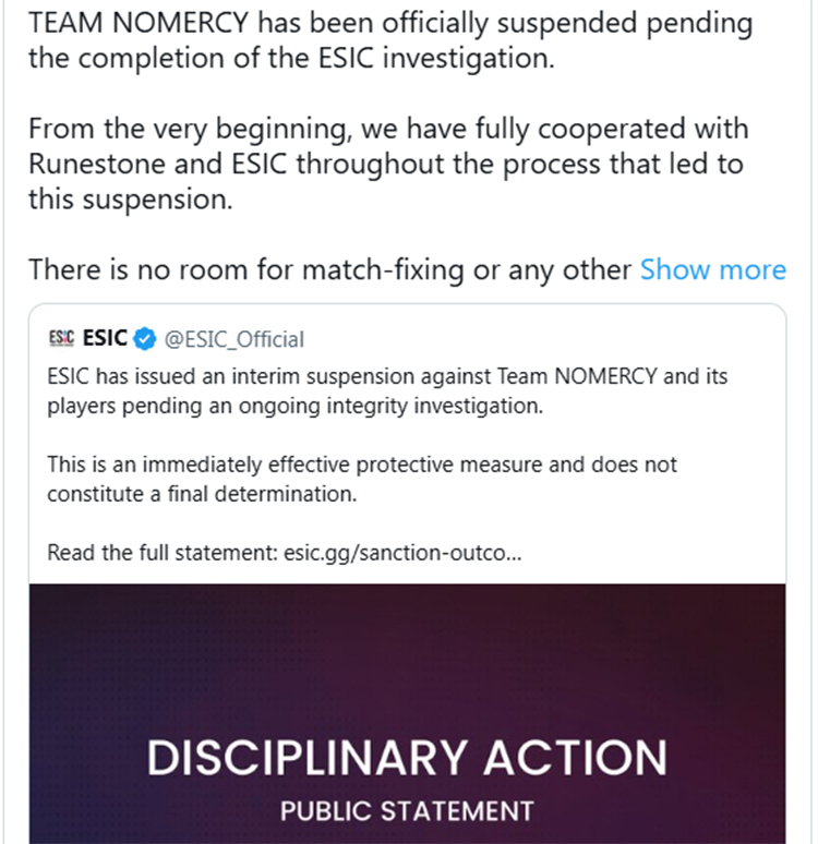 Esports Integrity Commission đã thông báo tạm thời đình chỉ đội tuyển NOMERCY cùng toàn bộ thành viên, trong khuôn khổ cuộc điều tra liên quan đến các dấu hiệu vi phạm chương trình liêm chính thi đấu.
