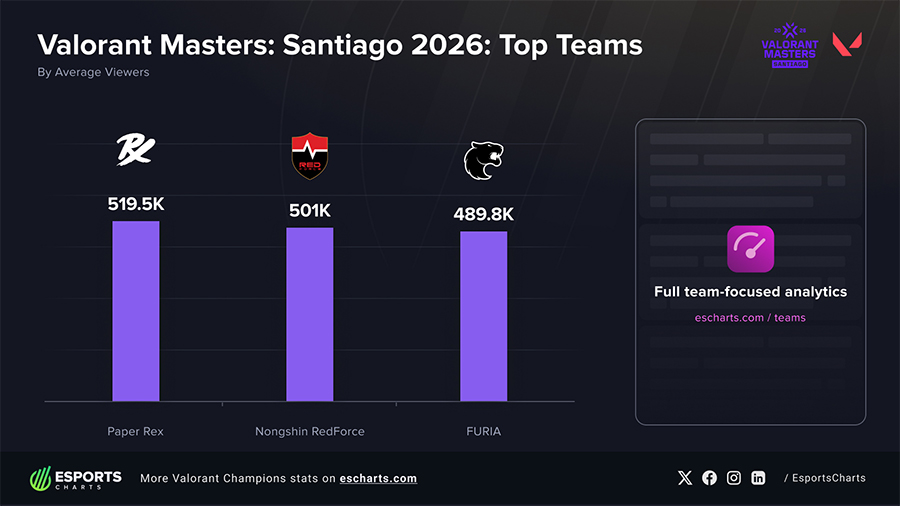 Ba đội tuyển dẫn đầu về lượng người xem tại Santiago đến từ ba khu vực khác nhau—Đông Nam Á, Đông Á và Nam Mỹ—phản ánh rõ sự lan tỏa toàn cầu của Valorant Esports.
