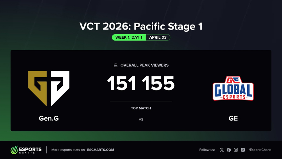 Ở trận đấu đầu tiên, Gen.G Esports đối đầu Global Esports, với chiến thắng bất ngờ 2-0 nghiêng về Global Esports. Trận đấu đạt đỉnh 151.155 người xem đồng thời (Peak Viewers) – con số tương đối ổn với một trận vòng bảng, nhưng thấp hơn đáng kể so với tiêu chuẩn thường thấy của khu vực Pacific.