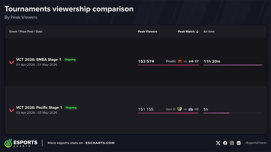 Sự sụt giảm này càng rõ rệt khi so sánh với khu vực VCT EMEA. Trận tâm điểm giữa Fnatic và Eternal Fire đạt hơn 153.000 lượt xem đỉnh – nhỉnh hơn cả hai trận mở màn của Pacific.