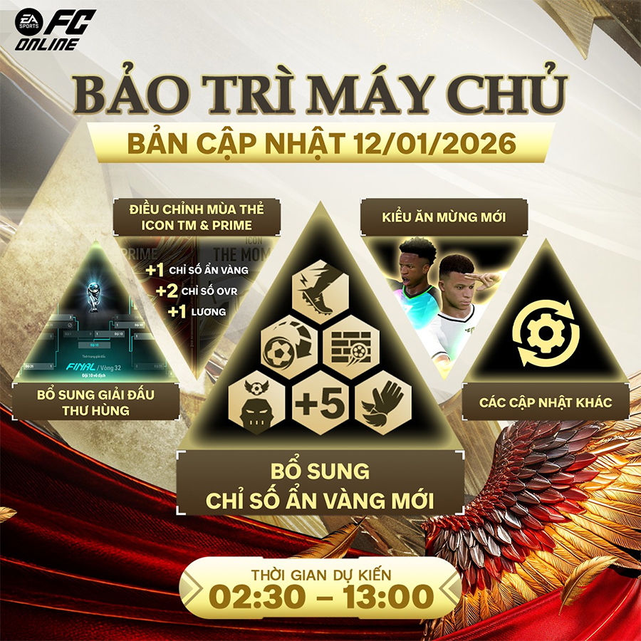 Vào rạng sáng ngày 12/1/2026, FC Online chính thức tiến hành bảo trì toàn bộ máy chủ (bao gồm cả bản Mobile) từ 02:30 đến 13:00. Đây là đợt bảo trì quy mô lớn, đánh dấu nhiều thay đổi quan trọng trong gameplay và hệ thống thẻ cầu thủ.