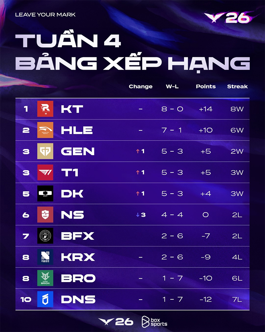 Tại ngày thi đấu mới nhất của LCK Mùa giải 2026, hai cặp đấu đều khép lại với tỷ số áp đảo 2-0, khi Hanwha Life Esports và T1 lần lượt đánh bại KT Rolster và Nongshim RedForce.