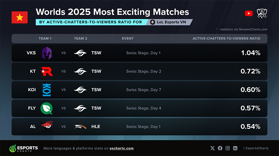 Trên kênh LoL Esports (tiếng Anh), trận đấu có chỉ số tương tác cao nhất trong giai đoạn Swiss Stage là cuộc đối đầu giữa Secret Whale và Vivo Keyd Stars, trận mở màn của vòng bảng CKTG 2025. Trận đấu đầu tiên của giải luôn có sức hút đặc biệt, và lần này chat YouTube ở tất cả các ngôn ngữ – bao gồm Hàn và Việt – đều hoạt động sôi nổi.