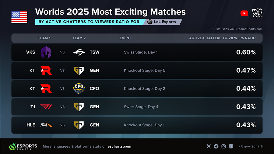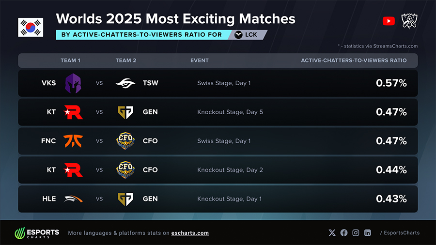 Nhìn chung, những trận đấu có tương tác cao nhất ở kênh tiếng Anh chủ yếu là các “derby Hàn Quốc”. Đáng chú ý nhất trong nhóm này chính là trận KT Rolster vs Gen.G ở playoffs, vượt qua cả trận T1 – Gen.G ở Swiss Stage và HLE – Gen.G trong trận mở màn vòng loại trực tiếp. Trận KT vs Gen.G kết thúc với chiến thắng 3-1 đầy cảm xúc dành cho KT, đội tuyển nhận được sự cổ vũ mạnh mẽ của cả fan quốc tế lẫn trong nước khi họ tiến gần đến lần đầu lọt vào chung kết thế giới.